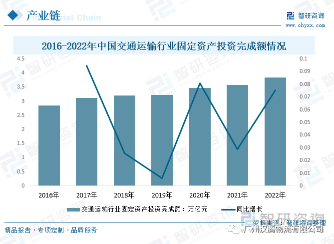 运输是物流的重要构成要素,交通运输业是物流的基本载体。2021年我国交通固定资产投资规模高位运行,全年完成交通固定资产投资预计超过3.58万亿元,同比增长0.1万亿元;2022年我国交通固定资产投资38545亿元,同比增长0.27万亿元。