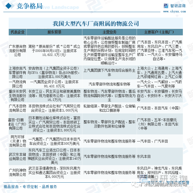 国内专业化的零部件物流企业数量很少,部分以整车物流或非汽车物流为主要业务的传统物流企业已开始进入零部件物流领域,比如长久物流、中远物流以及招商局物流等,但整体的市场份额很小。大型汽车厂商附属的物流公司一般是由汽车厂商或下属企业通过控股、参股的方式设立的物流企业,此类公司依附于所属整车制造企业,主要目的是满足集团内部的物流需求,规模较大且业务稳定,但拓展外部客户的能力相对欠缺。
