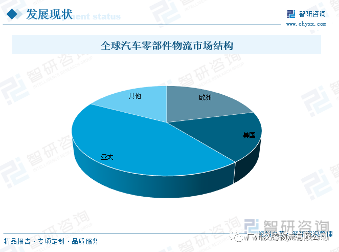 亚太地区已成长为全球最大的汽车零部件物流市场,市场占比为43.47%,欧洲市场占比为21.05%,美国市场占比为18.16%。