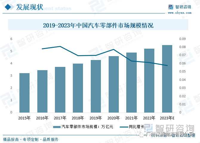 汽车产业链各个环节中的零部件需求增长同步带动了零部件物流业务的发展。相比整车,零部件更复杂精密,相应的物流业务对发运及时性、运输及仓储安全性要求较高。随着中国汽车行业的高速发展、汽车保有量的增加,我国汽车零部件行业得到了迅速发展,增长速度整体高于我国整车行业。2019年我国汽车零部件行业市场规模从2015年的3.21万亿元增长至4.28万亿,预计2023年我国汽车零部件市场规模将突破5.5万亿元。