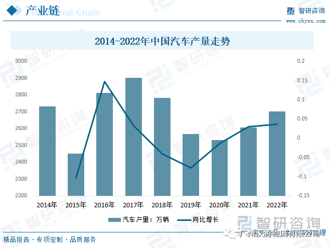 汽车零部件行业为汽车行业发展的基础。随着世界经济全球化、市场一体化的发展,汽车生产过程中投资、生产、采购、销售及售后服务、研发等主要环节呈现出全球性配置的趋势。据统计2022年中国汽车产量为2702.1万辆,我国汽车产总量连续14年居全球第一。