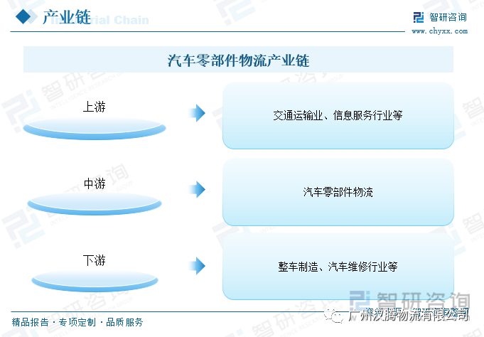 我国汽车零部件物流产业链的上游主要是交通运输业、信息服务行业等,下游主要是整车制造、汽车维修行业。